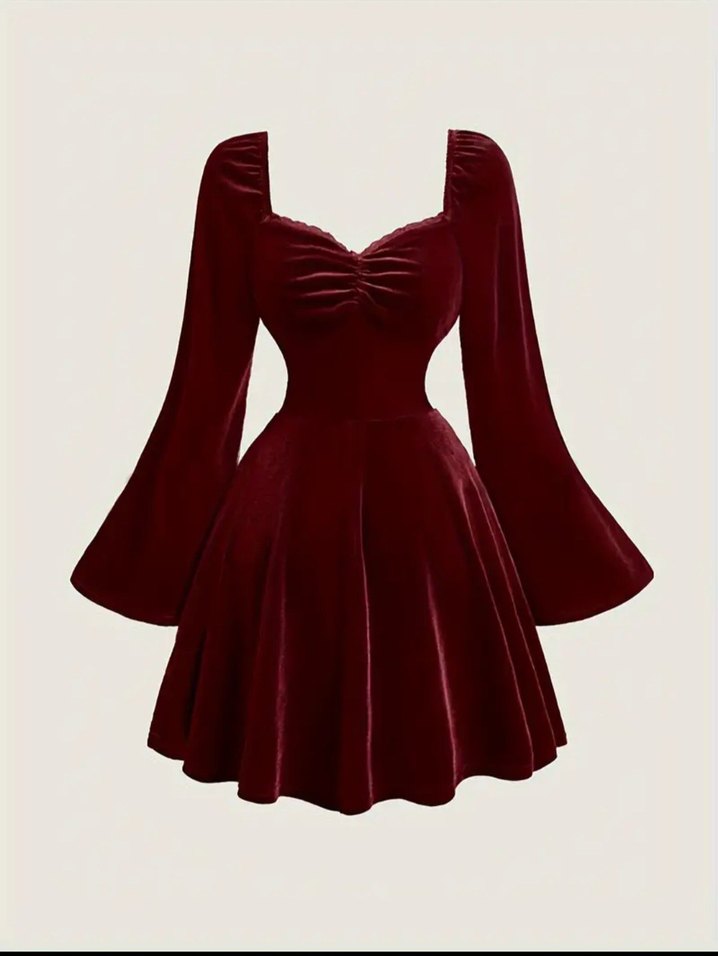 Bordo renk, süet kumaştan, V yaka ve uzun kolları volanlı, pileli etekli, normal boy, fitted kesim elbisedir. Ürün temu ürünüdür hiç giyilmedi bana olmadığı için satıyorum. S-M uyumludur