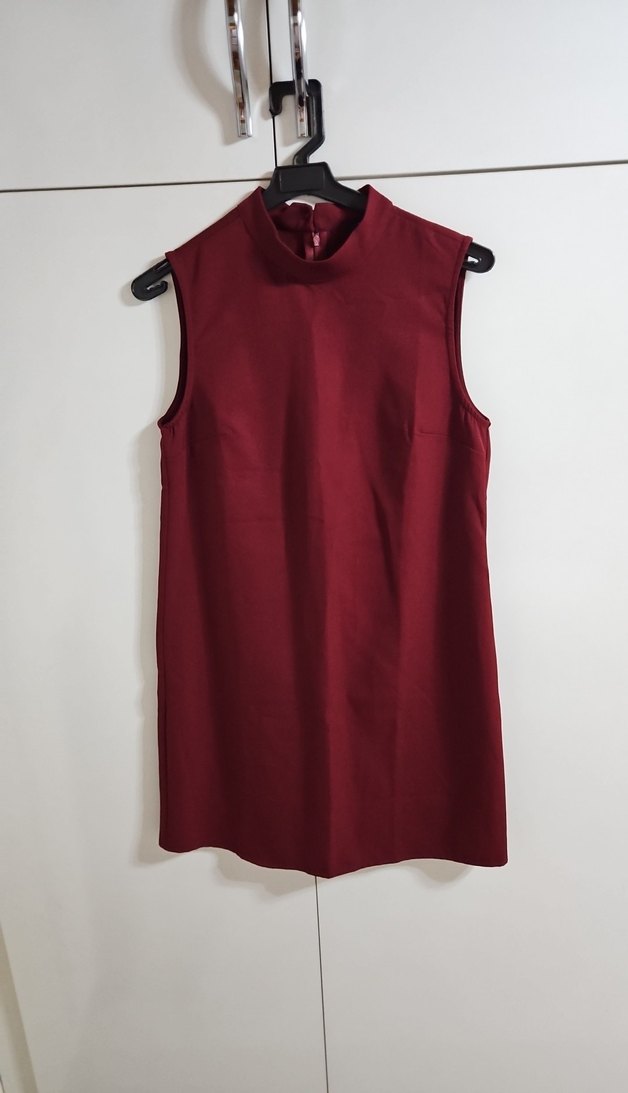 Kolsuz, bordo süet kumaştan yapılmış, yüksek yakalı ve midi boy, sade ve şık bir elbisedir. Ofis veya günlük kullanım için uygundur.