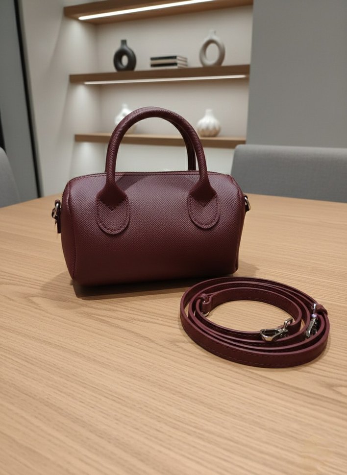 Bordo deri, desen içermeyen kadın çanta, çıkarılabilir askısı ile günlük kullanıma uygun minimalist tarzda. Zahmetsiz şıklık sunar.