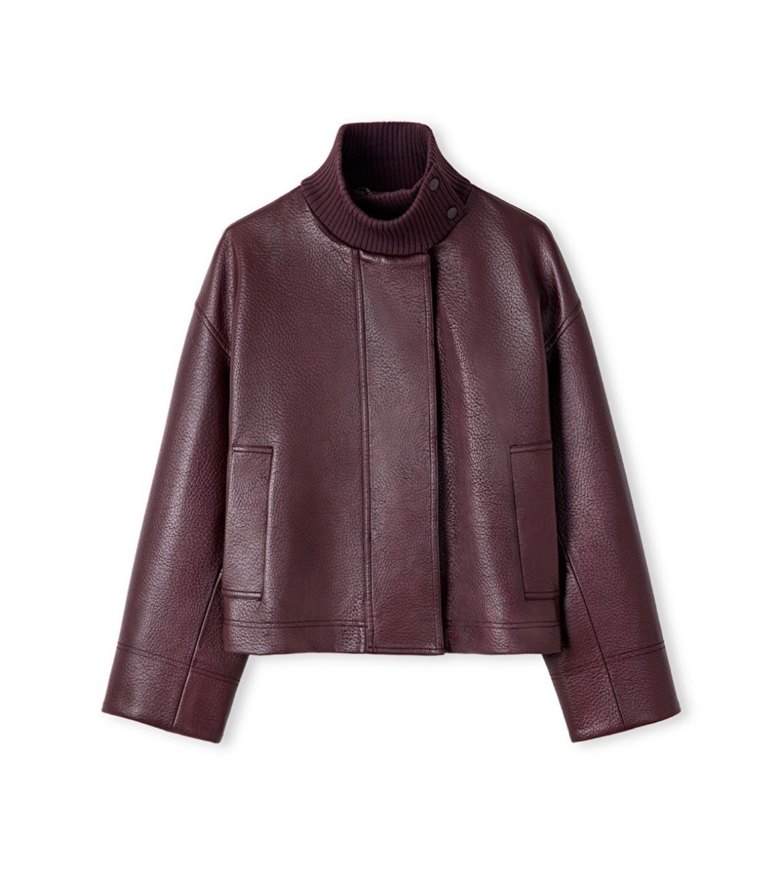 Bordo deri yüksek yakalı ve uzun kollu kadın ceket. Minimalist ve modern tasarımıyla günlük kullanıma uygundur. Etiketlidir fiyat sondur
