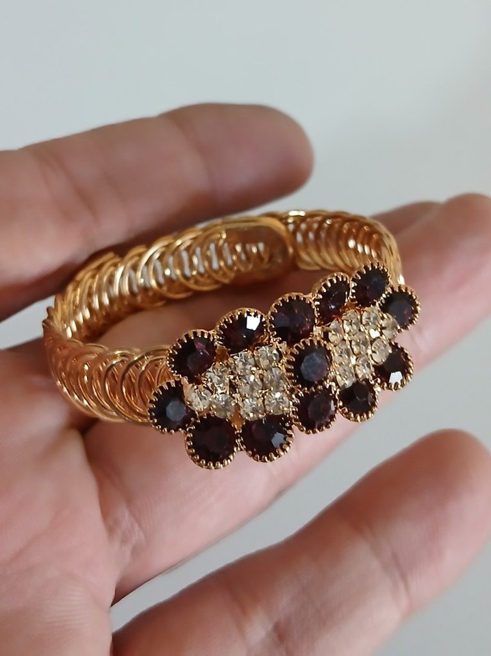 Bohem tarzda, bordo ve şeffaf taşlarla desenli, altın renkli kadın bilekliği. Düğünlerde şık ve göz alıcı bir aksesuar.