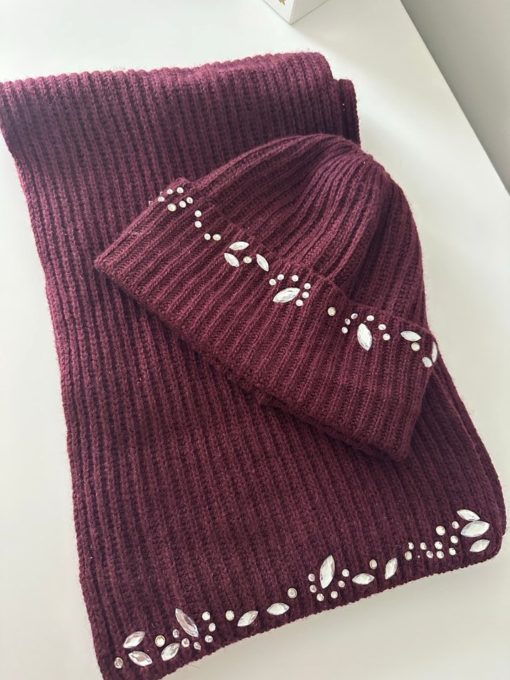 Bordo renkli örgü kadın bere ve atkı seti, parlak taş detaylarıyla bohem tarzda sıcak ve sade bir görünüm sunar. ❄️