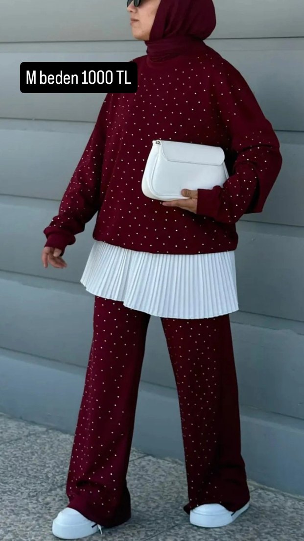 Bordo renk, parlak puantiyeli, piliseli mini etek detaylı bol kesim kadın takımı. Sentetik kumaştan, uzun kollu ve bisiklet yaka. Sokak tarzına uygun. M beden, fiyatı 1000 TL.