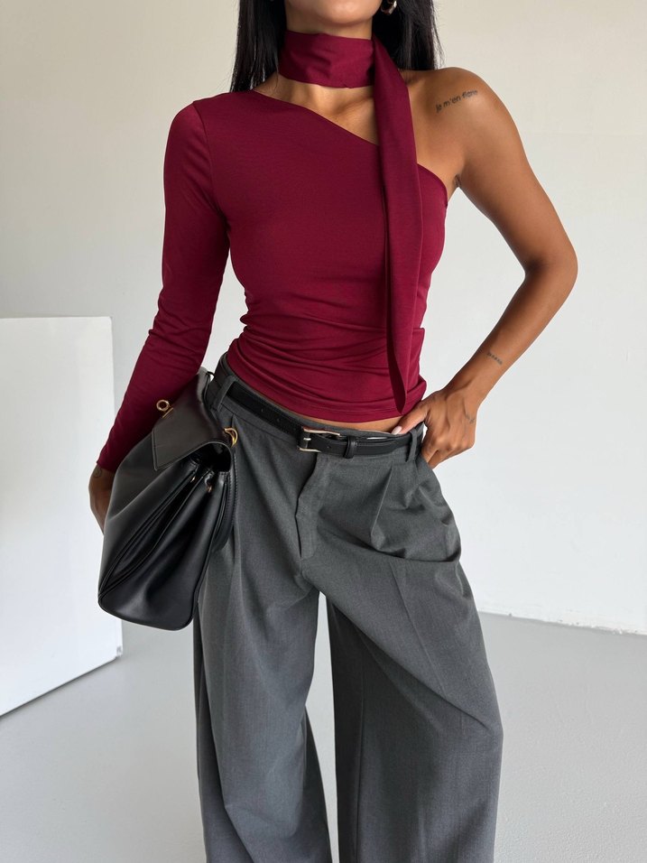 Bordo renk, yüksek yakalı ve tek omuzlu bluz. Uzun kollu ve kemerli, sentetik kumaştan, günlük rahat sokak stili için uygun.