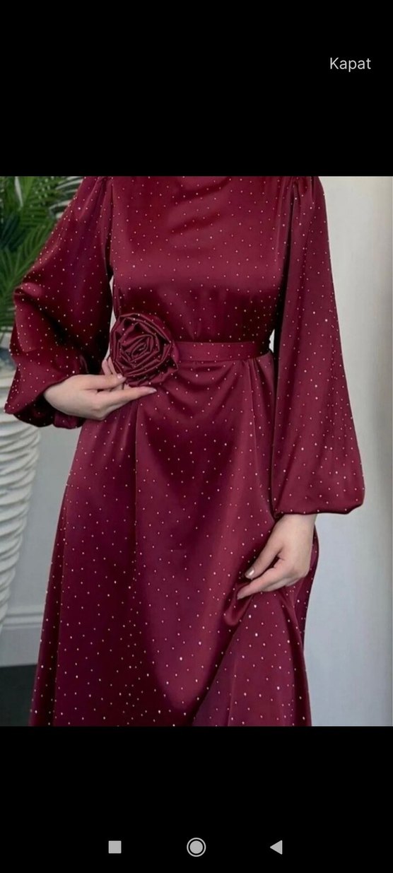 Mor renkli, uzun kollu ve yüksek yakalı uzun elbise. Salaş kesimi, parlak batik deseni ve drapeli tasarımıyla dikkat çeker. Günlük kullanım için uygundur.