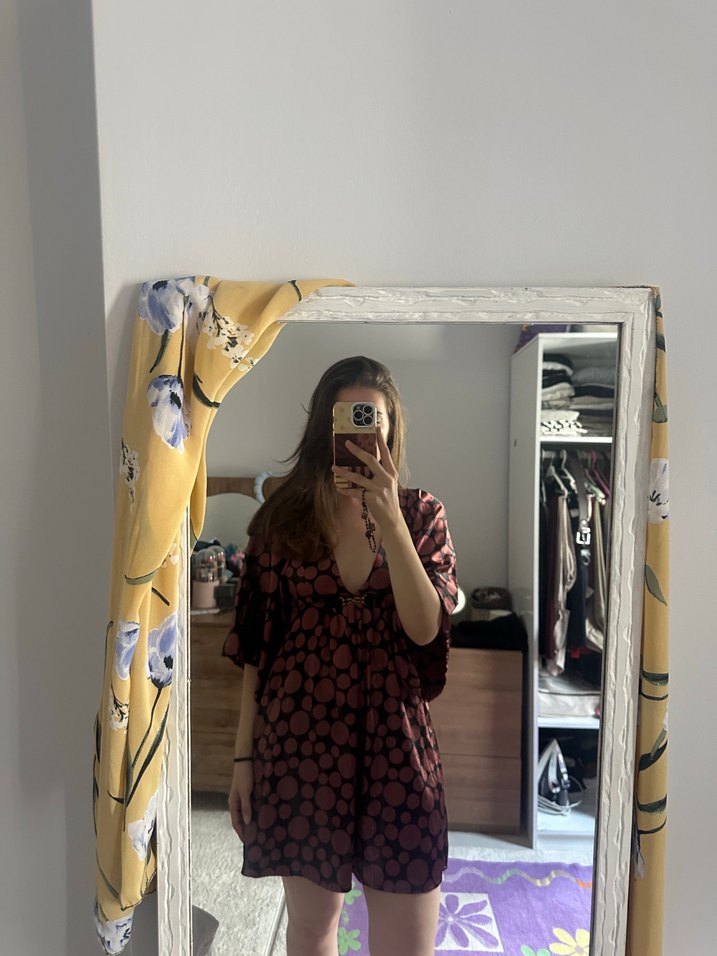 Bordo tie-dye desenli, uzun kollu, V yaka midi elbise. Salaş kesimli ve hafif transparan, ipeksi dokulu kumaştan üretilmiştir. Bohem tarzına uygundur.