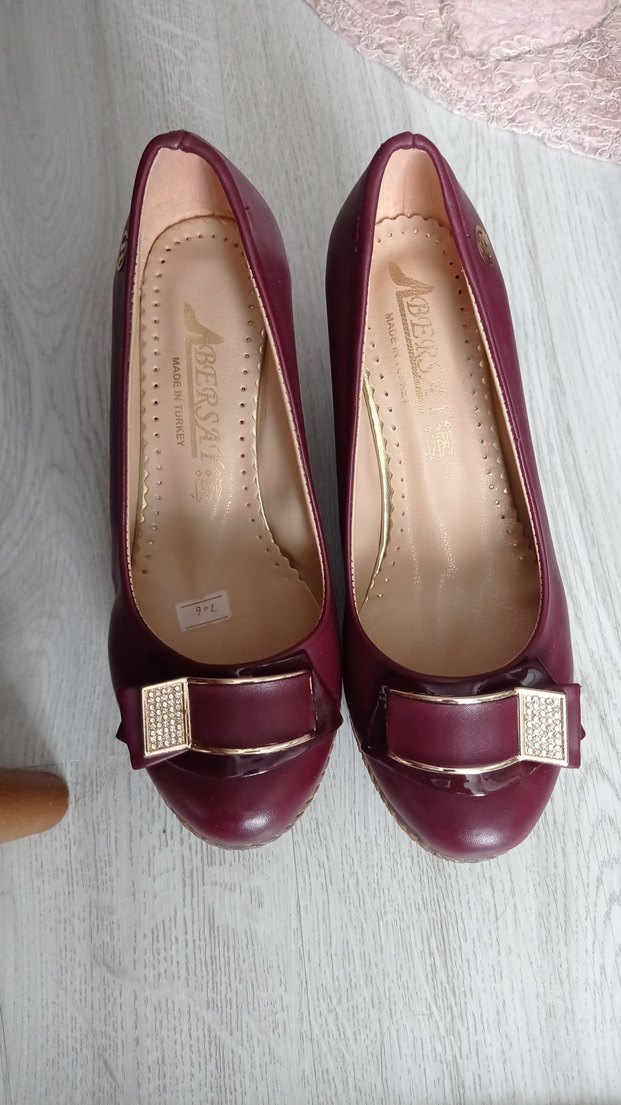 Bordo parlak yüzeyli, tokalı dolgu topuklu kadın babet, kauçuk malzemeden, günlük kullanım için uygun.