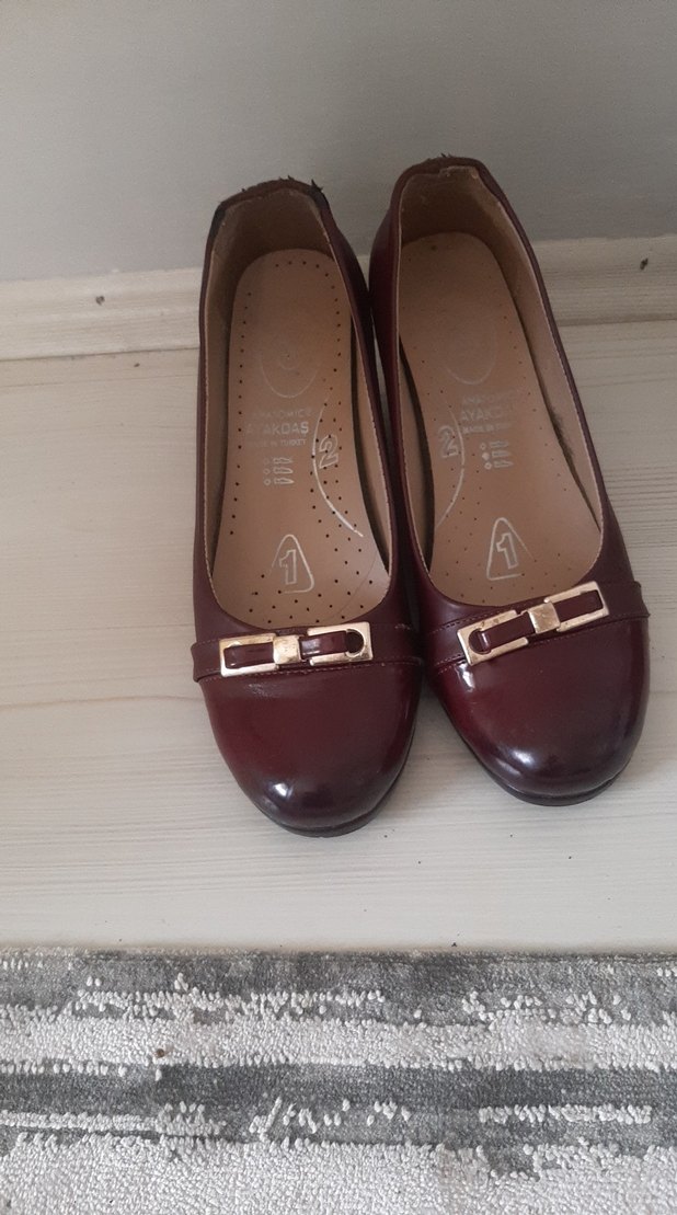 Bordo renkli, tokalı ve blok topuklu kadın babetleri parlak görünüme sahip, kauçuk malzemeden yapılmıştır. Günlük kullanıma uygundur.