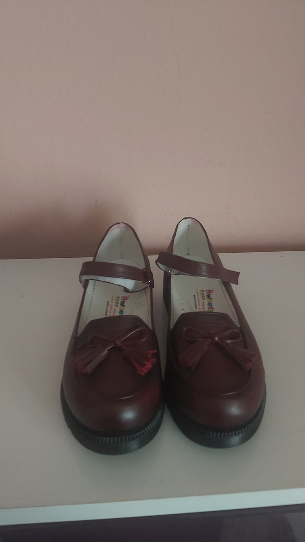 Bordo renkli çocuk klasik ayakkabılar, tokalı bant ile tasarlanmıştır. Kauçuk tabanlı, geleneksel bir stildir. Düz, koyu renkte ve püsküllü detaylara sahiptir.