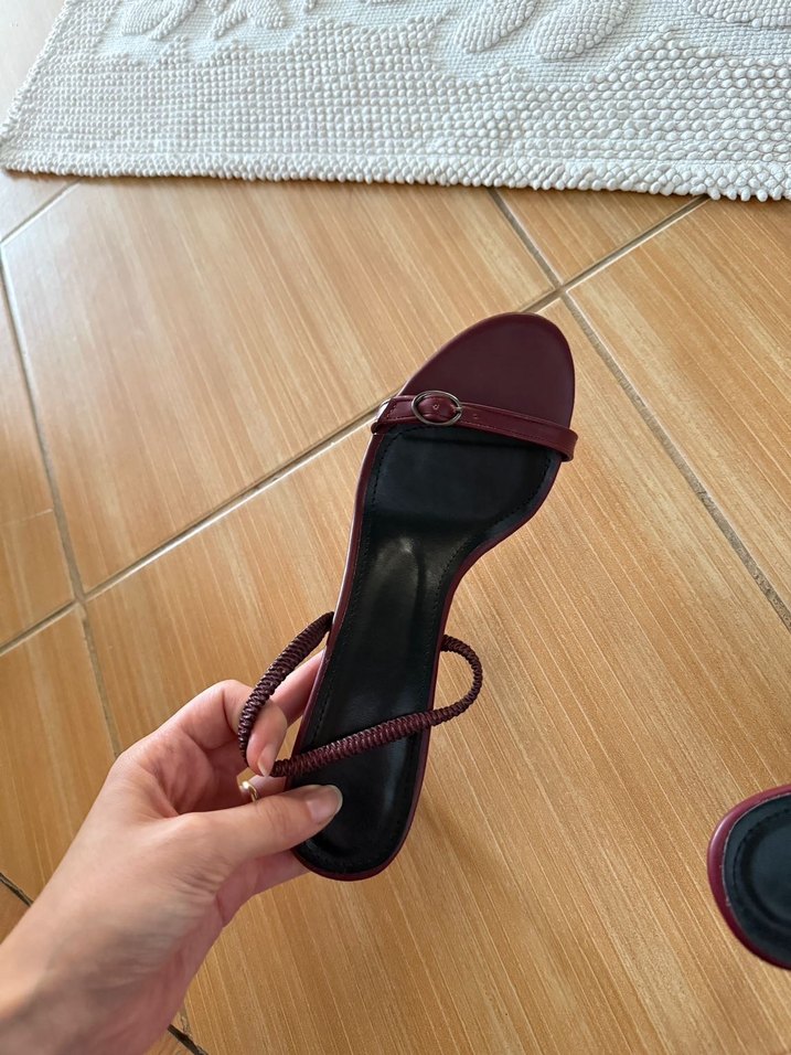 Bordo renkte, kauçuk tabanlı, tokalı bantlı stiletto topuklu sandalet., romantik akşamlar için uygundur. Hiç Giymedim küçük geldiği için ❤️.