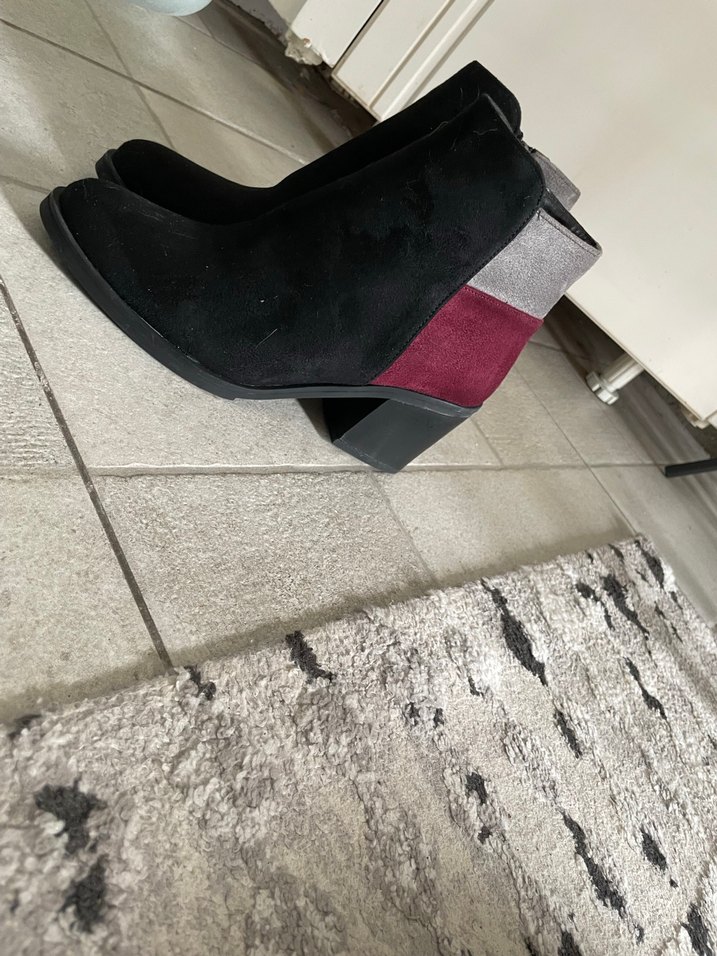 Bordo ve siyah renk bloklu süet kadın botu, blok topuklu ve tokalı detaylara sahip, günlük kullanıma uygun sokak stilinde. Belki bi kere giyildi uzun zaman oldu hatırlamıyorum ihtiyacı olan alsın diye uygun koyuyorum