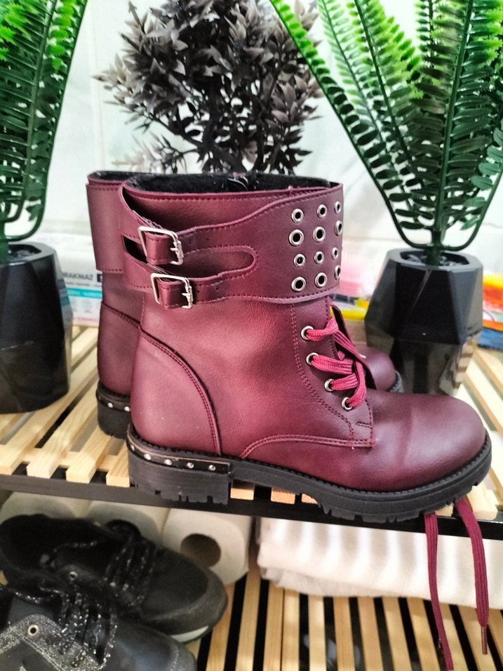Bordo deri kız çocuk bot, yüksek topuklu ve tokalı detaylarla rock punk tarzını yansıtır. Günlük kullanıma uygun, şık ve renkli bir seçim.