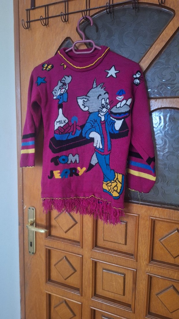 Bordo renkli, örgü kız kazak; bol kesim, uzun kollu ve yuvarlak yakalıdır. Tom ve Jerry baskısı ve püsküllü detaylarıyla bohem tarz sunar.
