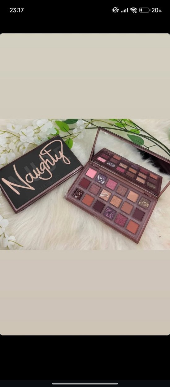 Mat ve ışıltılı bordo tonlarından oluşan göz farı paleti, 'Naughty' yazılı şık bir kutu ve uygulama aynası içerir.