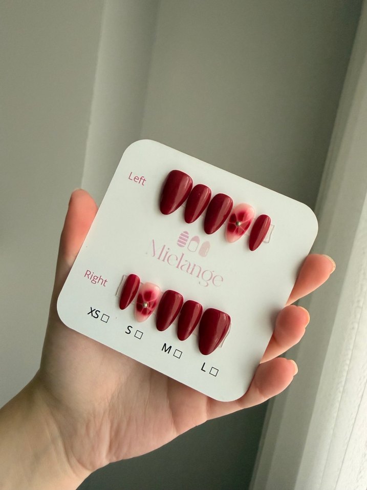 Parlak yüzeyli, koyu bordo tonlarında çeşitli boyutlarda tırnak süslemeleri. Sağ ve sol eller için işaretlenmiştir.