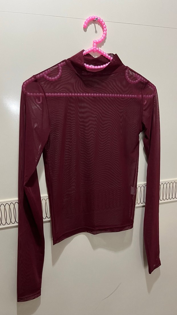 Bordo renkli, balıkçı yaka ve uzun kollu, vücuda oturan transparan kadın bluz. Sentetik kumaştan, normal boyda, günlük kullanıma uygun streetwear tarzında. S M uygun