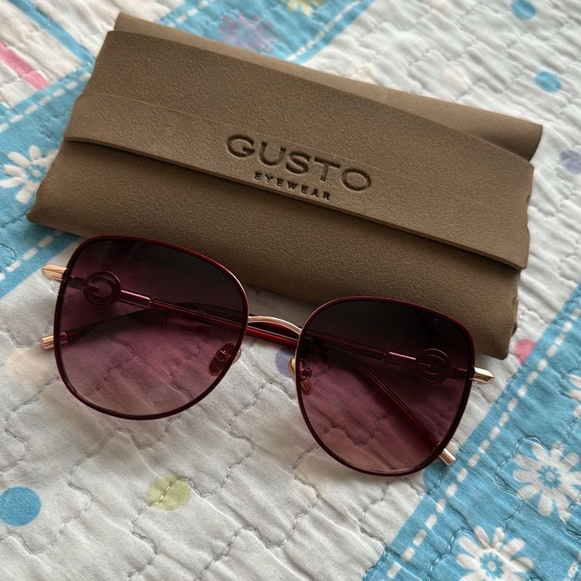 Bordo renkte, transparan çerçeveli ve koyu camlı Gusto Eyewear markalı modern kadın güneş gözlüğü.ürün orijinaldir Marmara form dan alındı