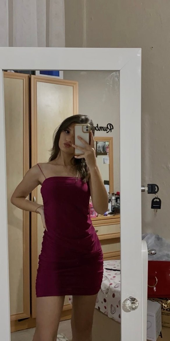 Bordo parlak renkte, transparan detaylı, ince askılı,diz üstünde, vücuda oturan abiye elbise.