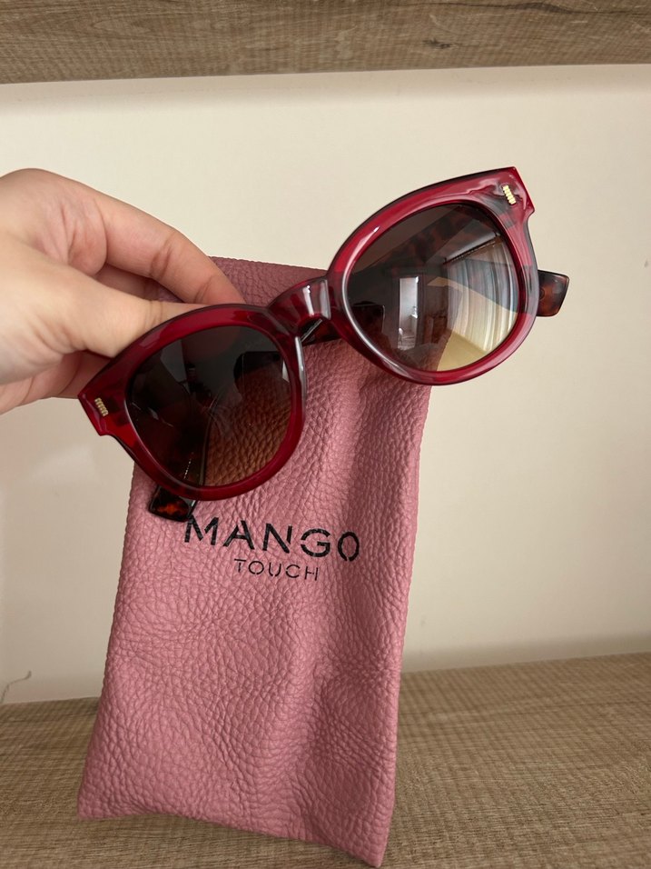Bordo kırmızı renkli, transparan çerçeveli modern klasik tasarıma sahip kadın güneş gözlüğü. MANGO TOUCH yazılı yumuşak kılıfıyla birlikte gelir. Trendy casual tarz için uygun.