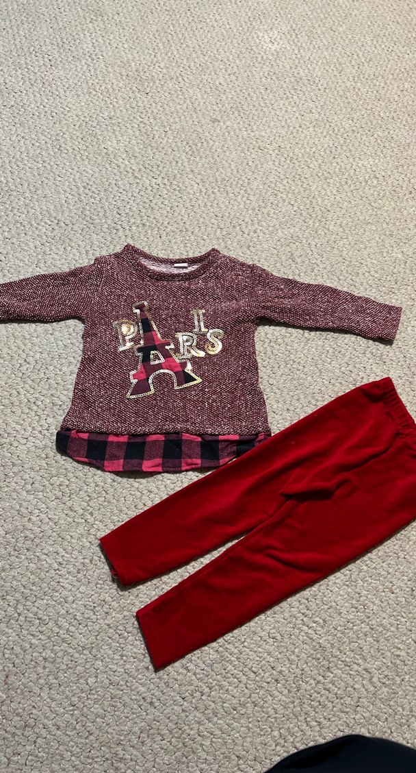 Bordo triko kumaştan uzun kollu üst, üzerinde Paris baskısı ve ekose detaylı katmanlı görünüme sahip. Kırmızı pantolon ile takım halinde.