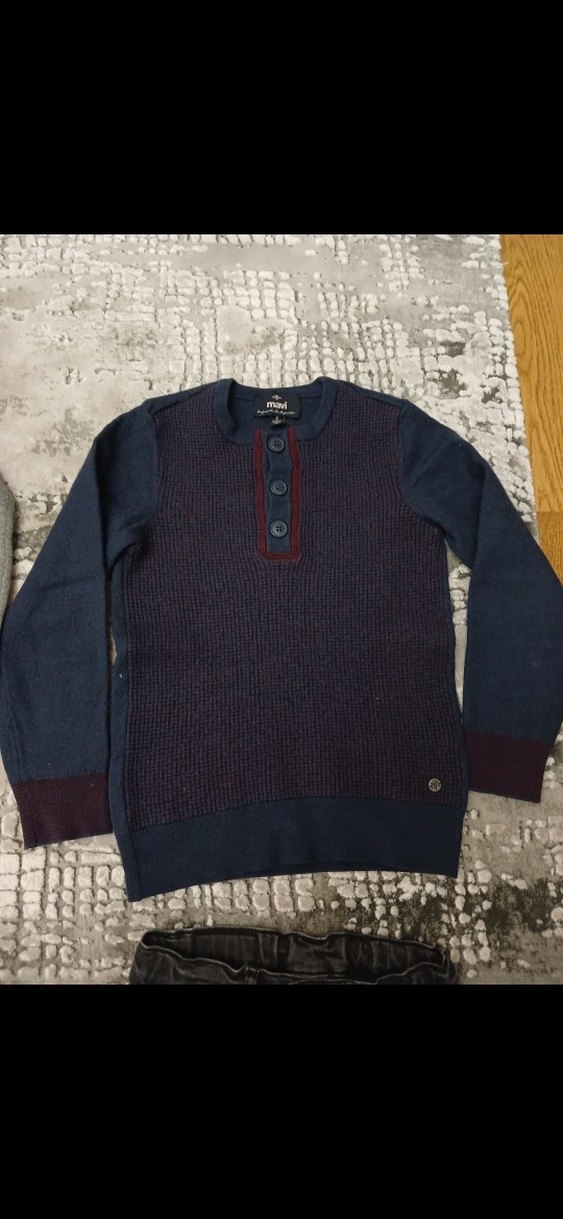 Uzun kollu, yuvarlak yaka erkek çocuk kazak, sıcak yün ve triko dokusuyla. Bordo renginde, regular fit ve sokak stiline uygun.