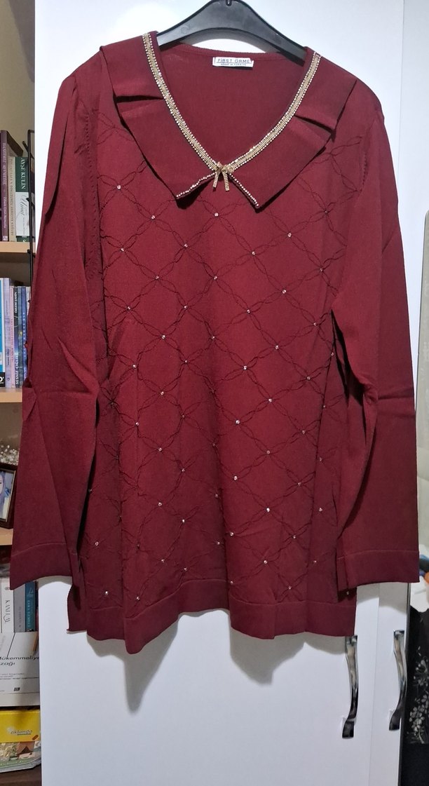 Bordo renkli, yakalı ve uzun kollu triko kadın bluz. Rahat kesimli, parlak ve desen içermeyen dokusu ile günlük kullanıma uygun. ✨