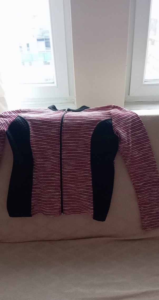 Dar kesim, uzun kollu ve bisiklet yaka kadın ceketi. Yumuşak sentetik triko kumaştan, bordo renkte ve siyah yan panellerle. Günlük kullanıma uygun, midi boyda.
