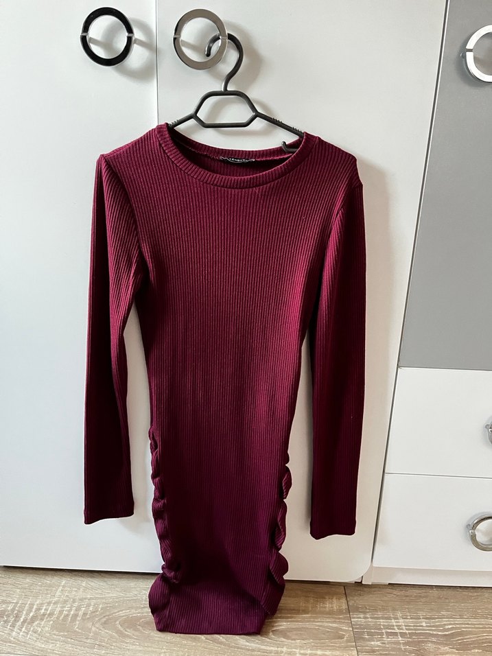 Bordo renkli, uzun kollu, triko kumaştan yapılmış, vücuda oturan midi uzunluğunda, yuvarlak yakalı kadın elbisesi. Minimalist ve şık görünümüyle romantik akşamlar için uygun.