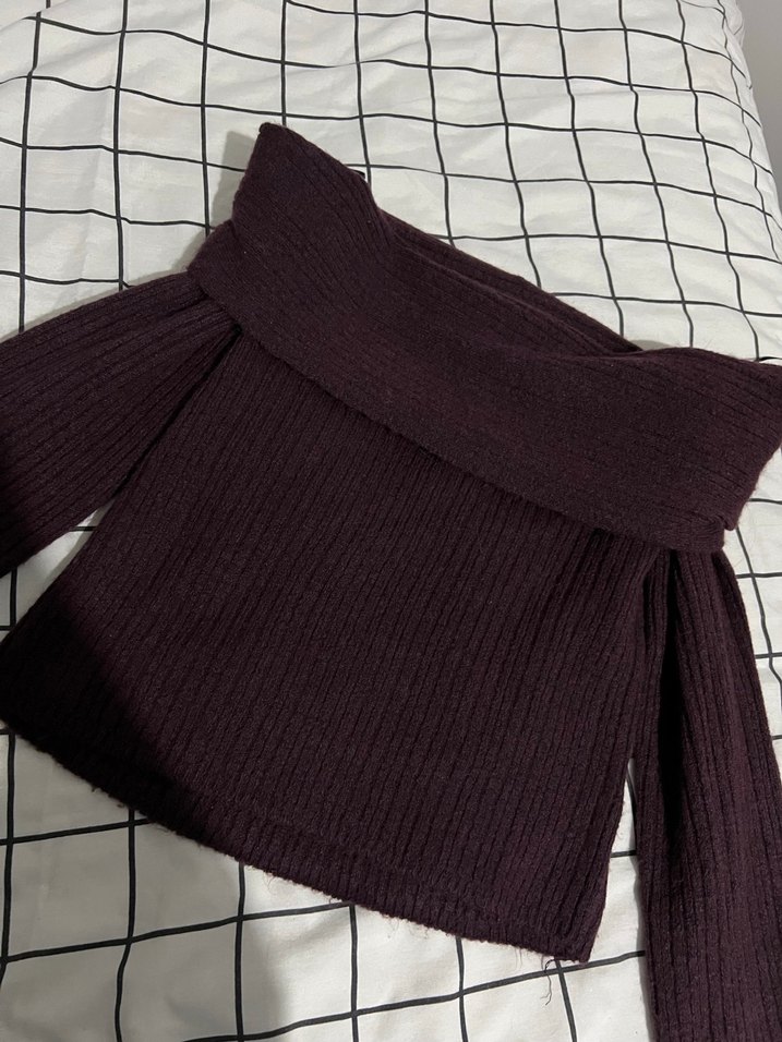 Bordo renkte, triko dokuma, kayık yaka ve uzun kollu, rahat ve desen içermeyen, günlük kullanıma uygun kadın kazak.