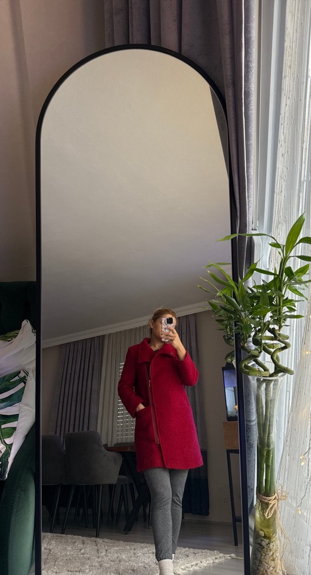 Bordo renkli, triko kumaştan yapılmış hamile kabanı, fitted kesim ve kesik yakaya sahip. Uzun kollu ve midi boydur, günlük kullanım için uygundur.