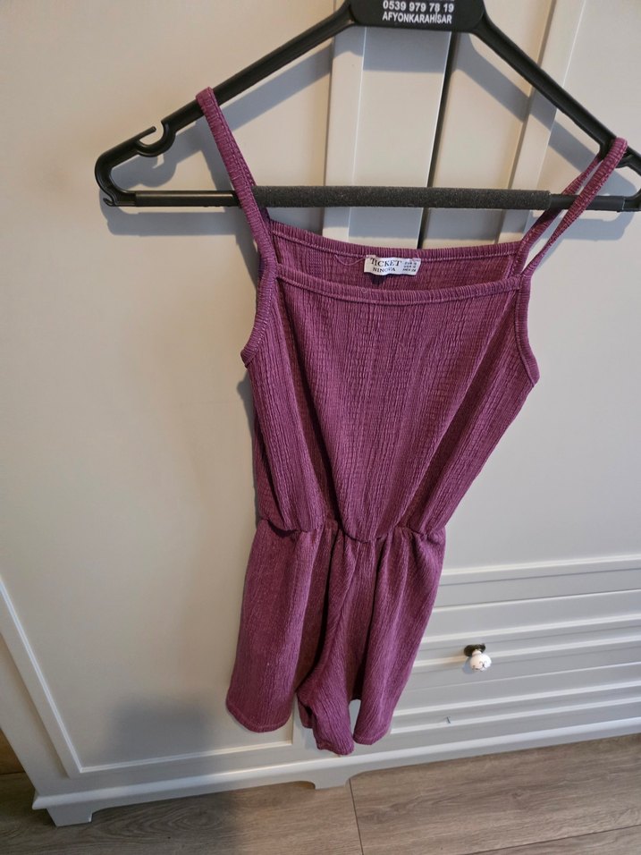 Bordo renkli, triko dokulu ve ince askılı kısa tulum. Yumuşak keten kumaştan, rahat ve şık sokak stiline uygun.