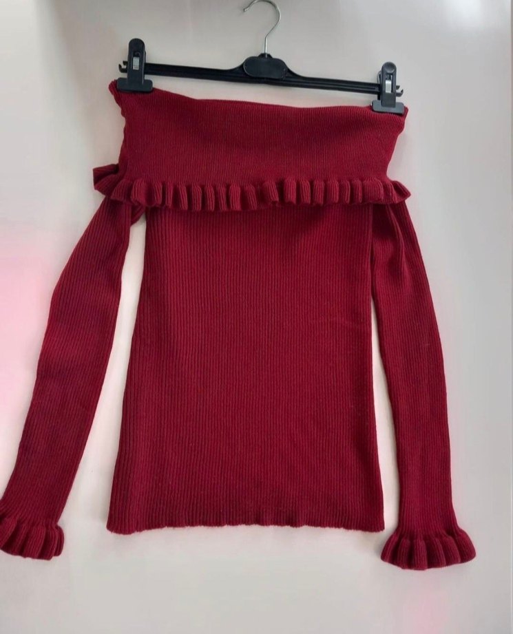 Bordo renkli, uzun kollu, triko kumaştan yapılmış, fırfır detaylı kısa kesim ve kayık yaka kazak. Rahat ve retro bir tarz sunar. standart beden
