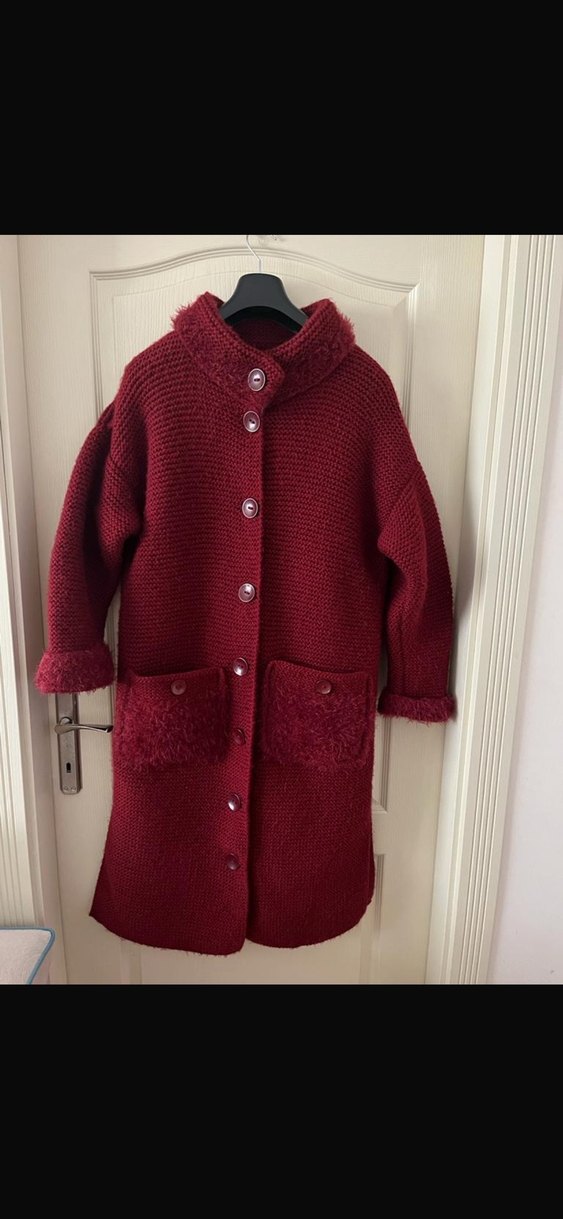 Sıfır el örgüsü bordo renkli, uzun kollu, rahat kesim kaban. Düğmeli ve cepli, sade desensiz tasarımıyla günlük kullanım için uygun. 48 bedene kadar uygundur