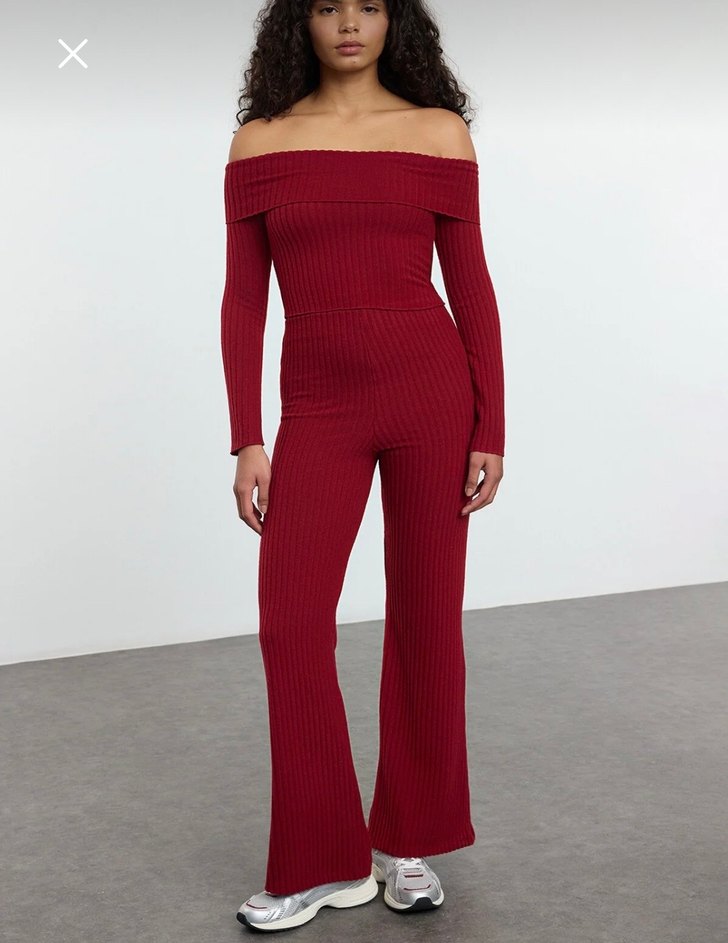 Bordo triko dokulu, omuzları açık geniş yakalı uzun tulum. İnce ve desen içermeyen, uzun kollu model. Üst L beden ama dar kalıptır alt s beden M bedene de uyumludur. M beden için uygun