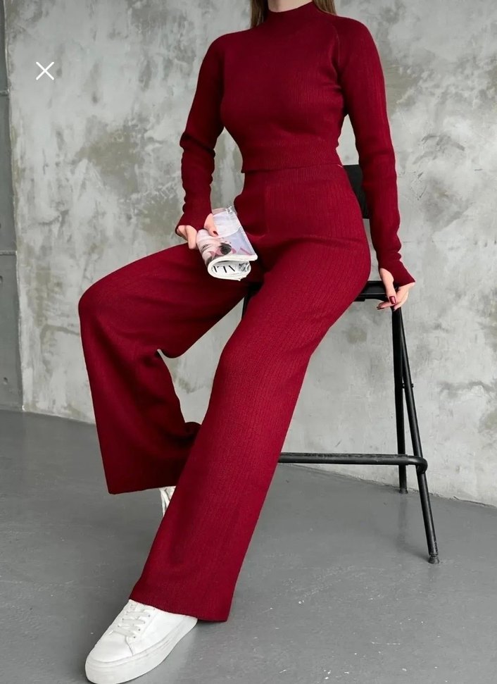 Bordo Triko Yüksek Yakalı Kadın Eşofman Takımı