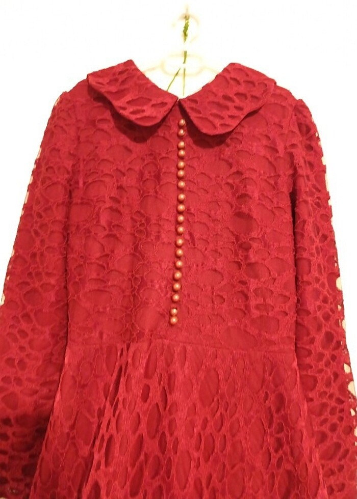 Bordo tüllü elbise boy 130 santim iki kolu arası göğüs 40 santim kol uzunluğu 59 santim kalça 46 santim önden düğmeleri var açılmayan sırtında fermuarlı bebe yakalı elbise