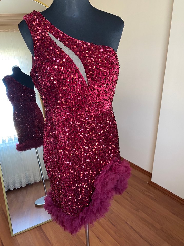 Hiç kullanılmadı. Bordo renk, mini boy, payetlerle kaplı, tek omuz askılı ve tüy detaylı kısa abiye elbise. Parti için uygun, şık ve dikkat çekici.