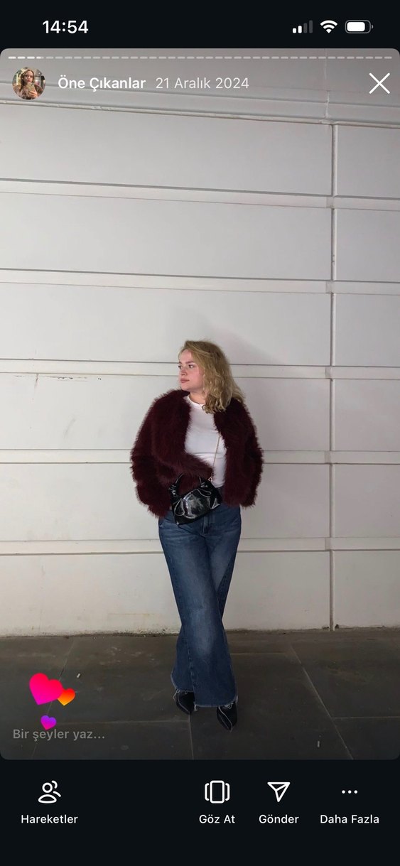 Bordo renkli, tüylü detaylı, normal boyda ve bol kesim kadın. Notlu yaka tasarımına sahiptir ve günlük kullanıma uygundur.