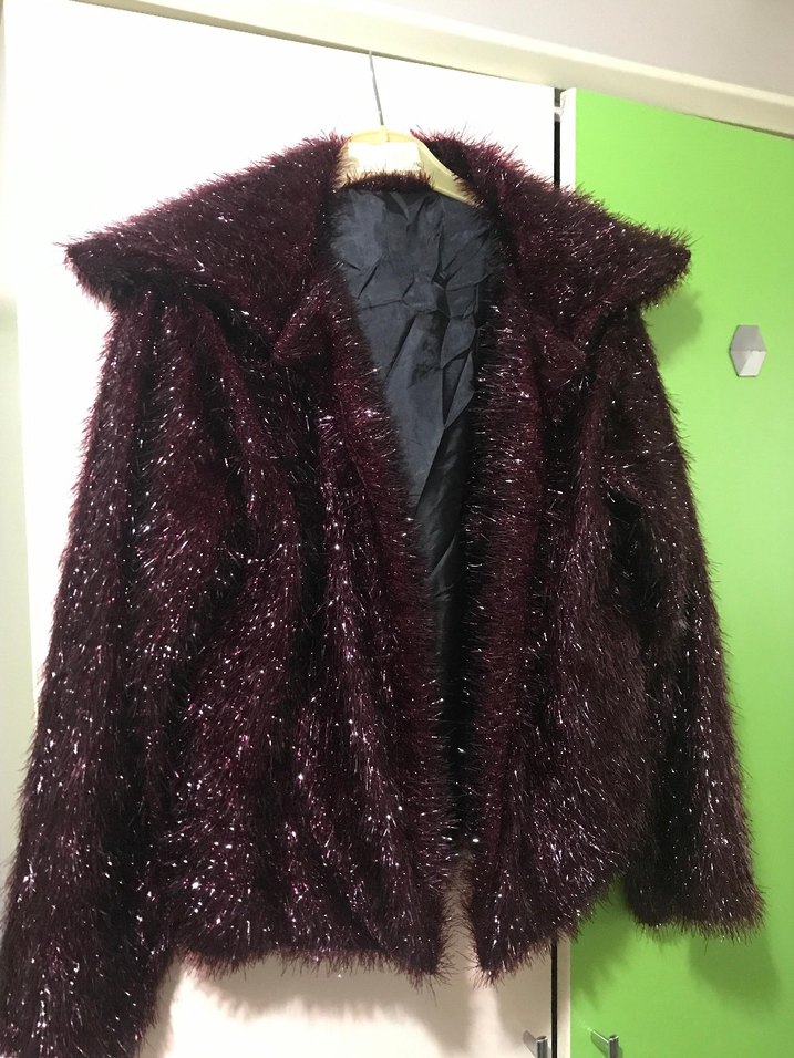 Bordo renkli, tüylü detaylı peluş ceket. Notlu yaka ve bol kesimiyle parti için uygun, midi boy ve uzun kolludur. ✨