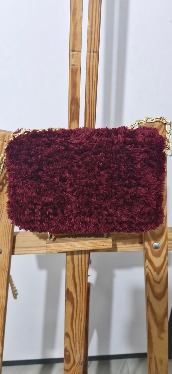 Bordo renkli, yumuşak tüylü dokulu triko kadın çanta, parlak görünümlü ve altın zincir askılı, bohem tarzda rahat bir tasarıma sahip.