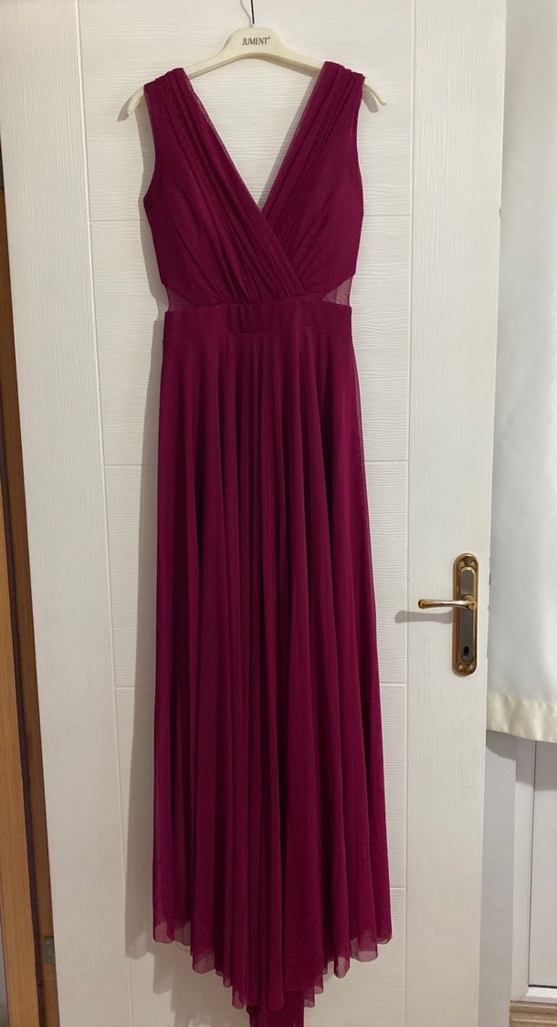 Bordo renkte V yakalı uzun abiye elbise. Kolsuz, düğünler için uygun. 38 beden bir kere giyildi
