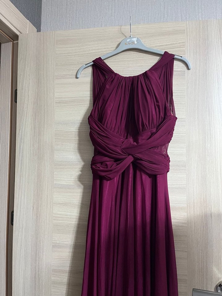 Bordo renkli, modern klasik tarzda, ince askılı ve fit kesimli uzun abiye elbise, düğünler için şık bir seçenek.