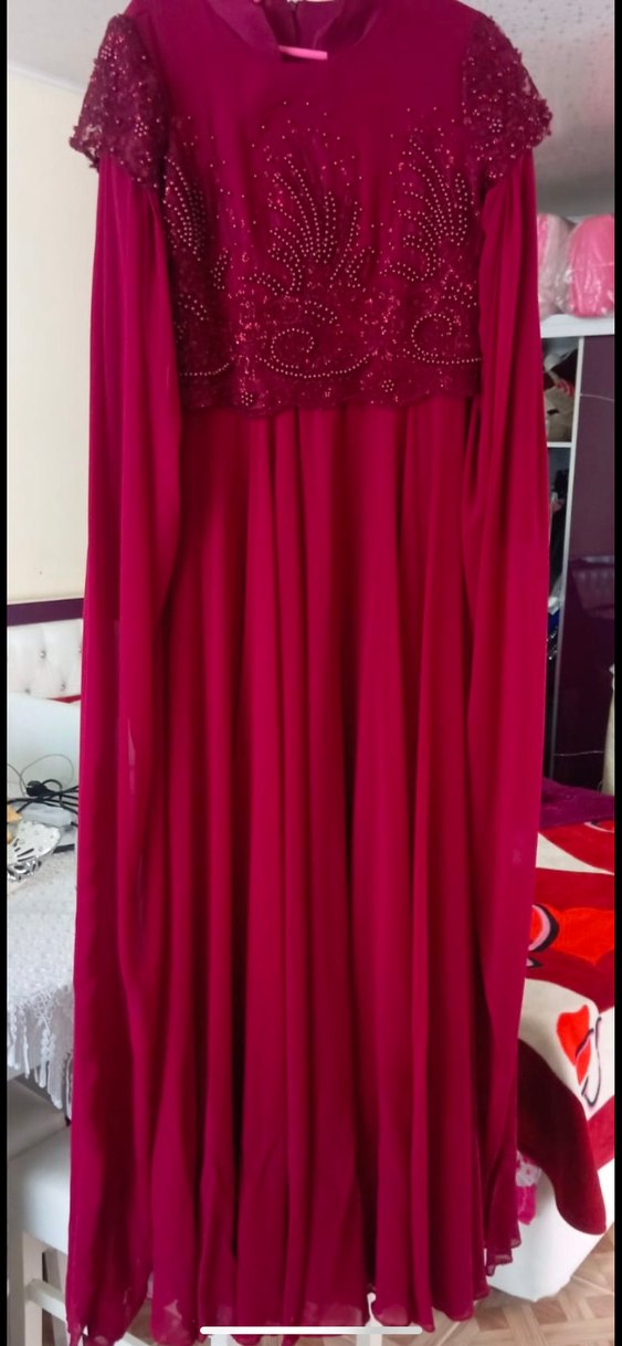 bol kesim, bordo uzun abiye elbise. Parlak nakış detaylarıyla düğünler için uygun. Bir kez kullanıldı sorunsuz 38 M beden