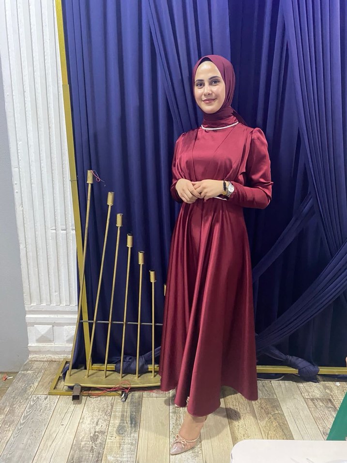 Bordo renkli, uzun kollu ve yüksek yakalı, drapeli parlak kumaştan abiye elbise. Düğünler için uygun, mütevazı ve rahat kesim.