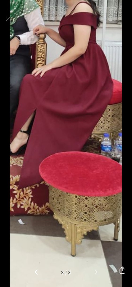 Bordo renkli, V yaka ve askılı kollu, uzun abiye elbisedir. Düğünler için uygundur.