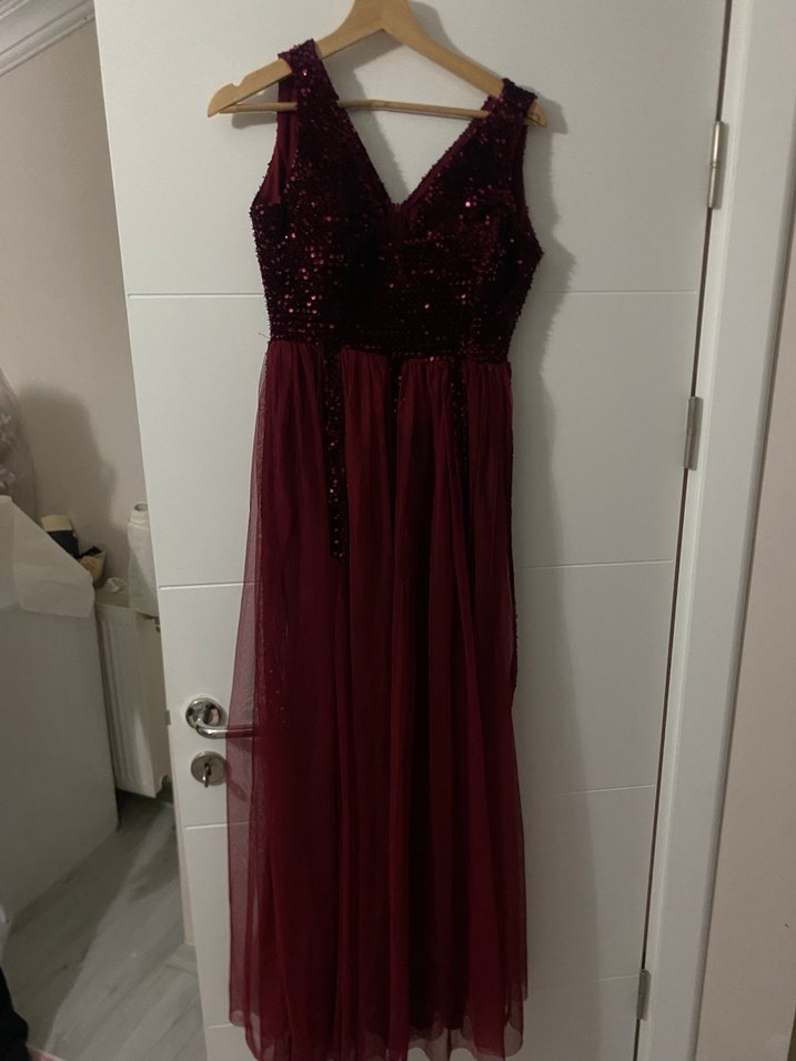 Bordo uzun abiye elbise, V yaka ve drapeli detaylara sahip. Kolsuz ve klasik modern tarzda, düğünler için uygun şık bir model. ✨
