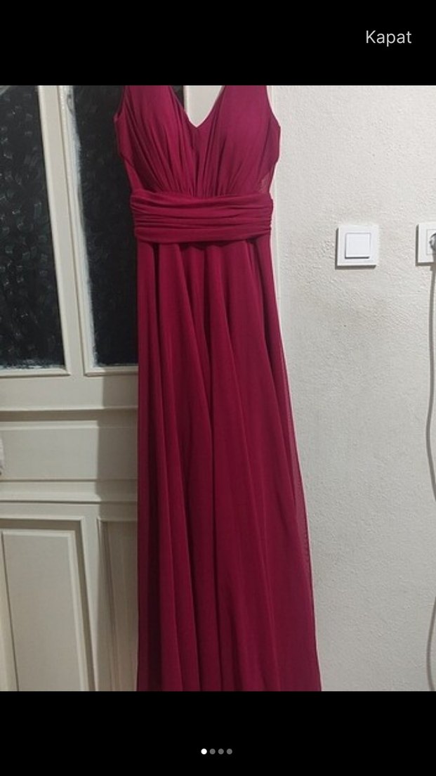 Bordo renkli, uzun ve askılı abiye elbise. V yaka, drapeli detaylar ve fitted kesimle modern klasik tarzda, düğünlere uygun bir modeldir.Resimlerde rengi pembemsi çıkmış aslında bordo.Kumaşı esnektir üst kısım esniyor