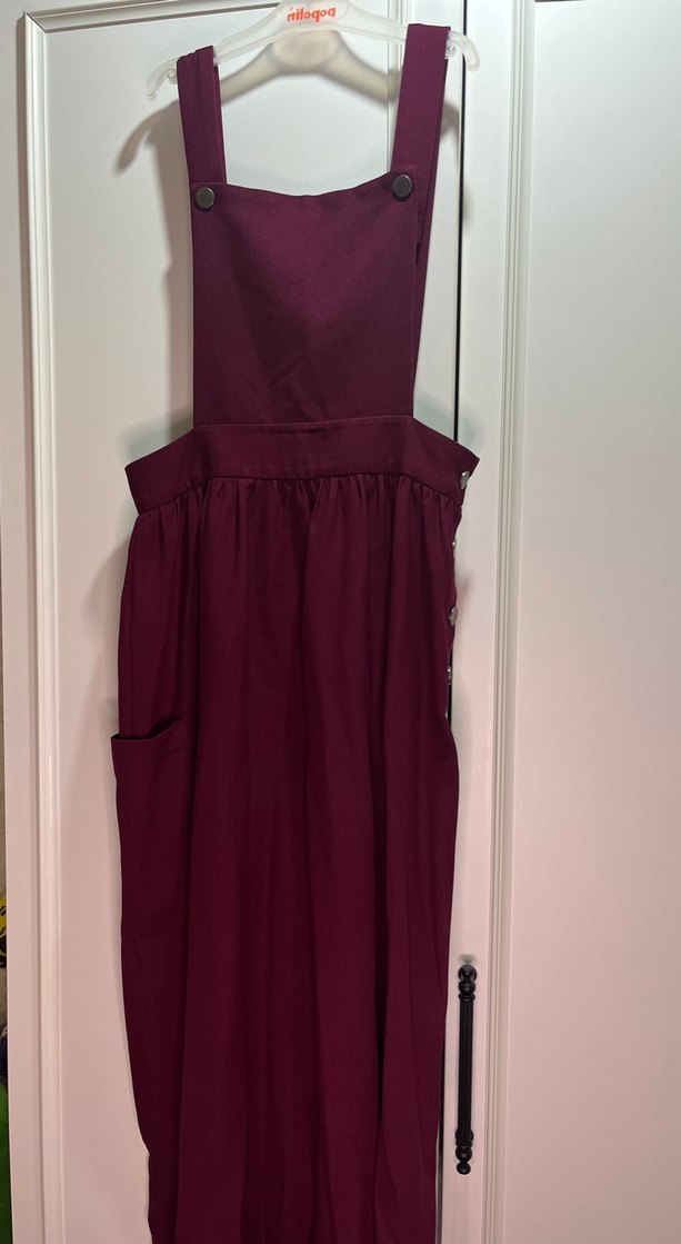 Bordo renkte, askılı ve straplez yaka uzun kadın tulumu. Dökümlü ve bol kesim, sentetik kumaştan, vintage tarzda.