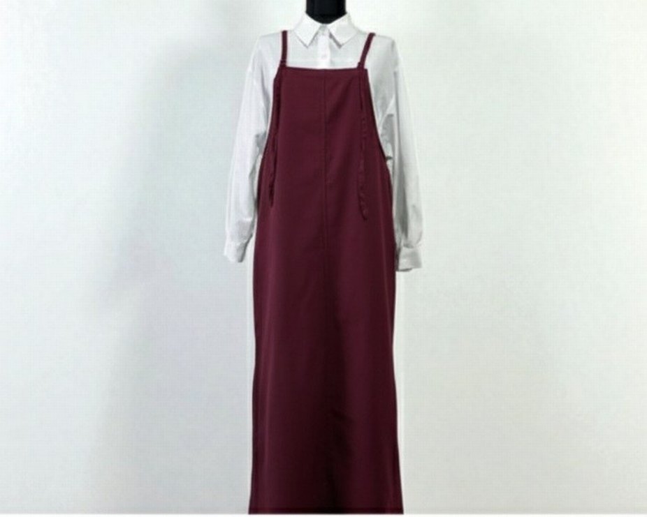 Bordo renkli, askılı, salaş kesim uzun elbise. Sentetik kumaştan, yüksek yakalı ve desensiz tasarımıyla sade ve şık bir görünüm sunar. jile