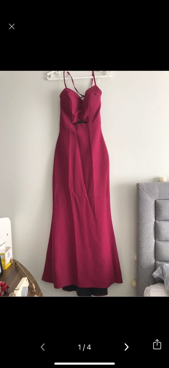 Bordo, uzun ve askılı, V yakalı, Göbek detaylı ve vücuda oturan klasik şıklıkta abiye elbisedir. 1.55 boy 11 santim topukluyla giyilmiştir. 34 beden.